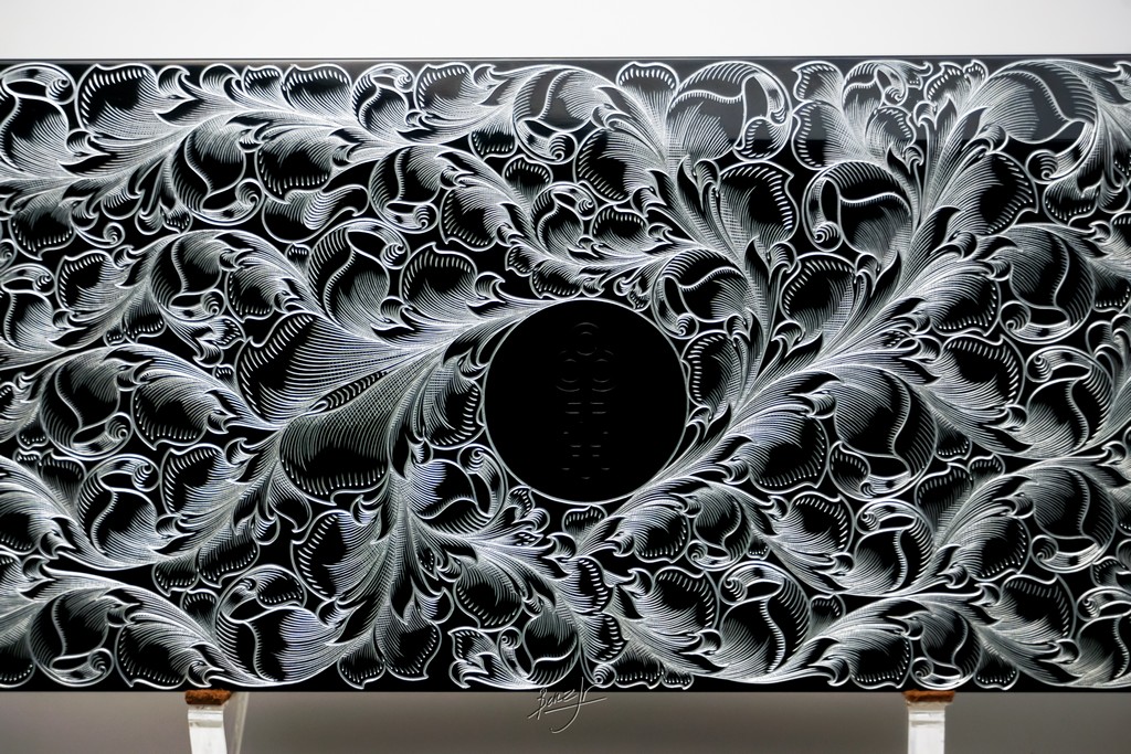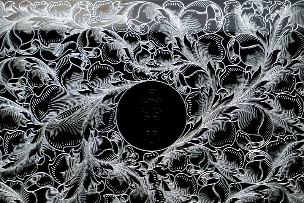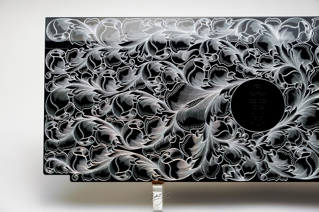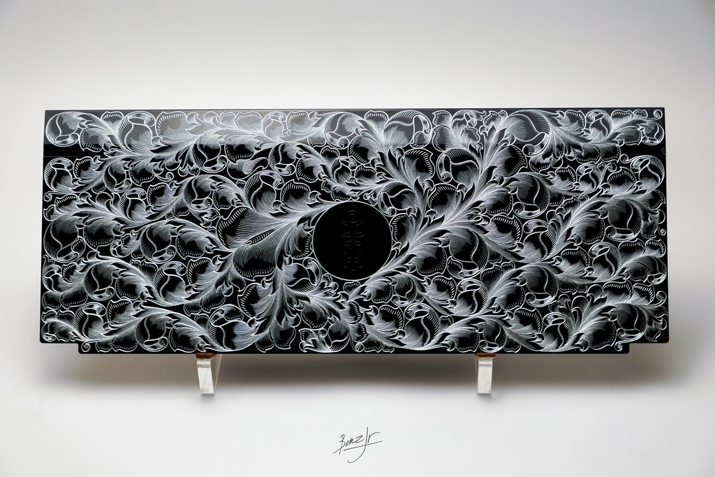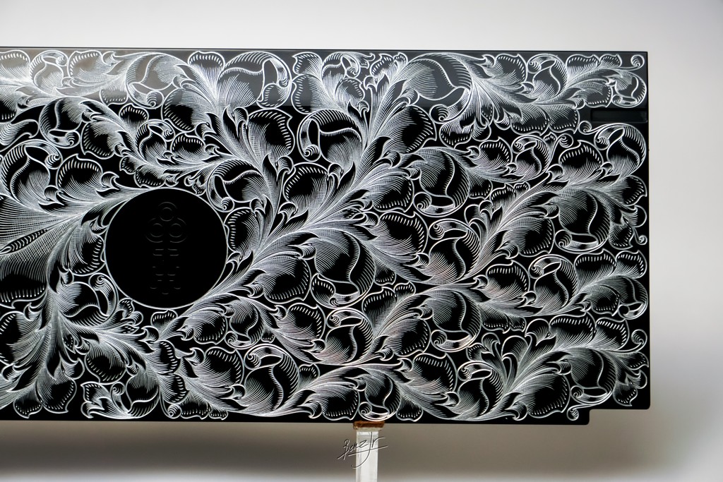 I hand-engraved this glossy black keyboard base over the course of about two months, featuring Benz Jr’s signature design. This is my first project working on a coated material, which was quite challenging to control.