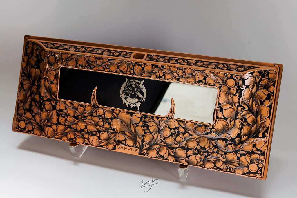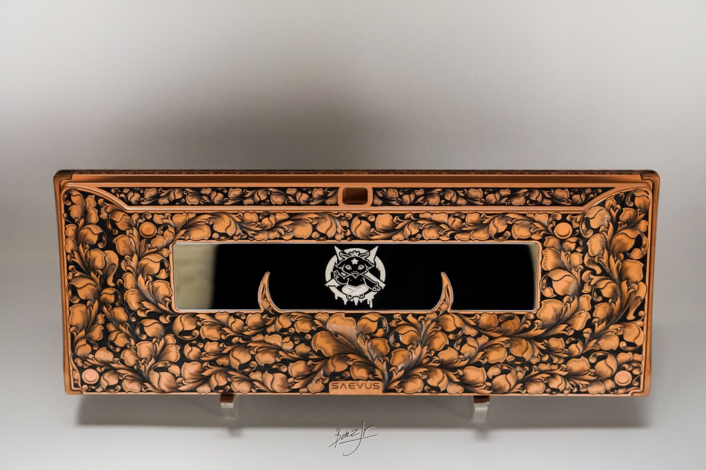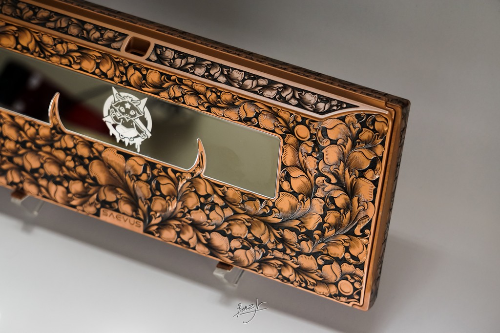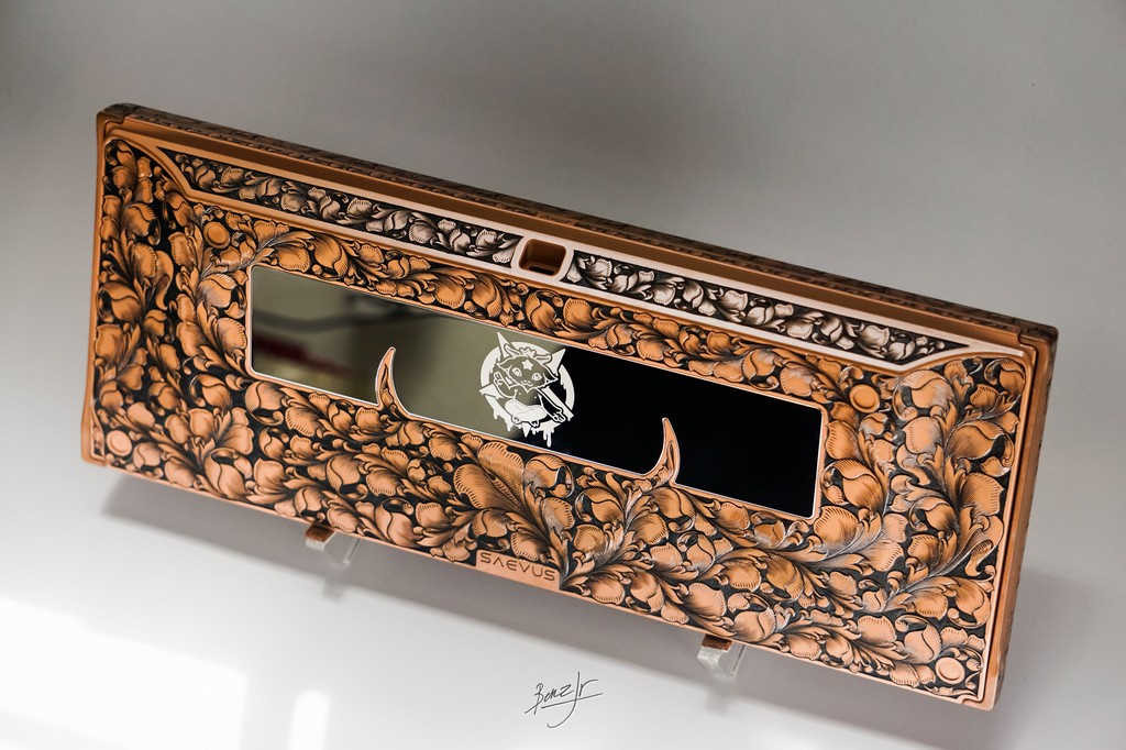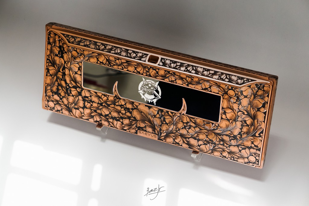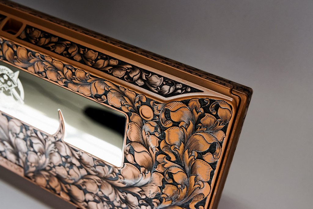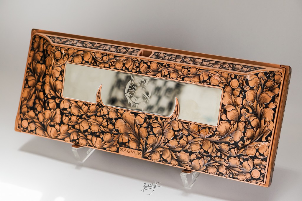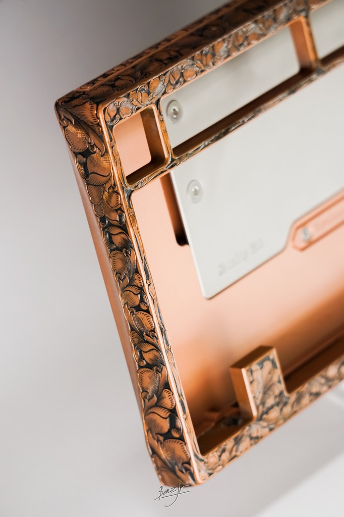 This keyboard piece showcases intricate hand-engraving across its entire surface, transforming a functional object into a refined work of art. The copper-toned base is covered with dense, flowing patterns that create depth, texture, and a strong visual rhythm. Each detail is carefully carved, giving the design a sense of movement and organic growth.