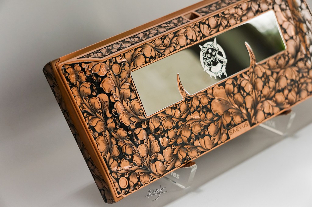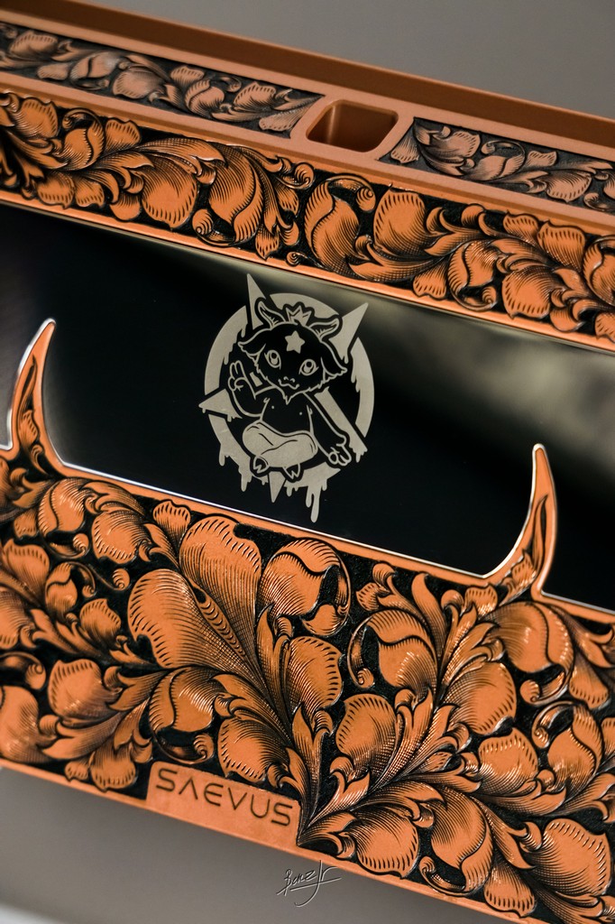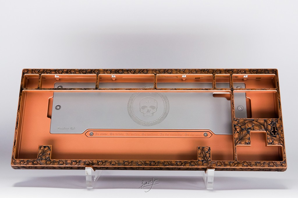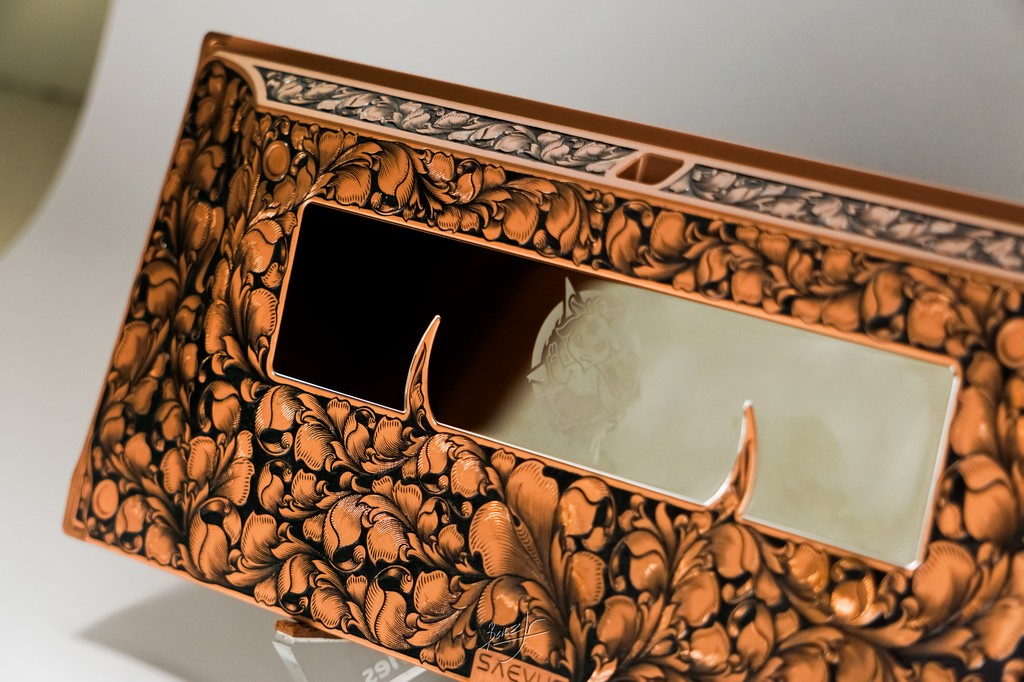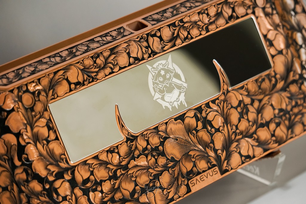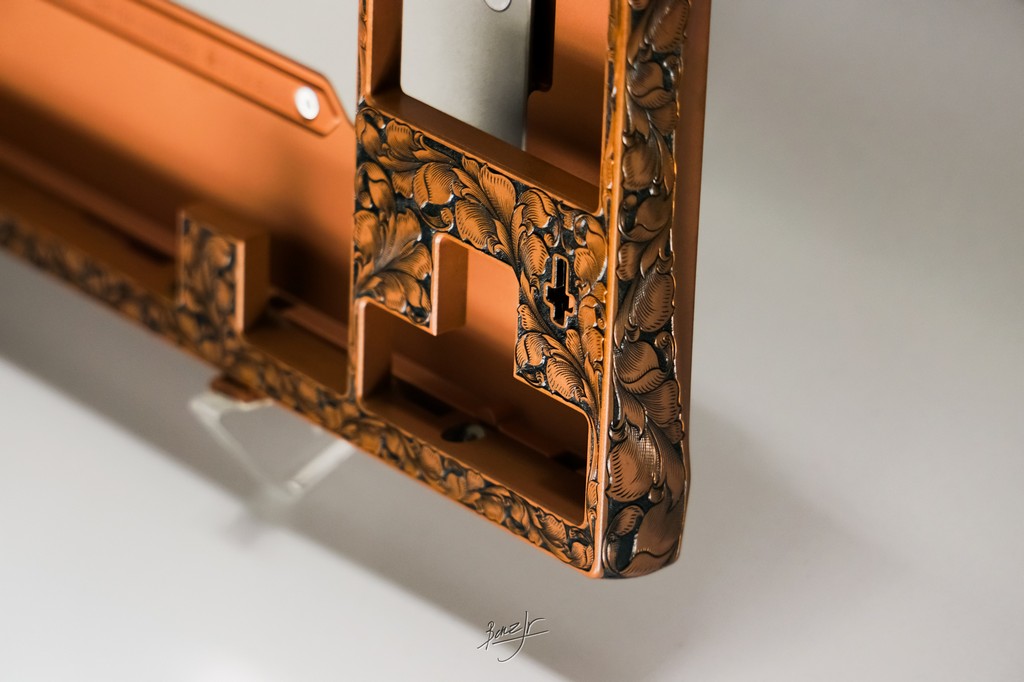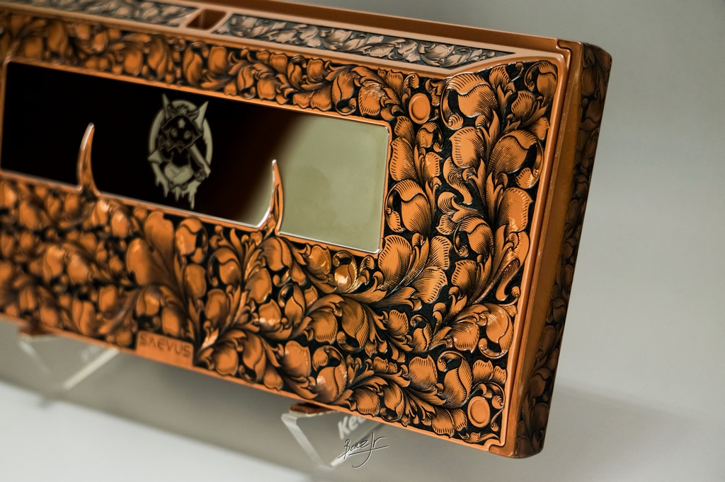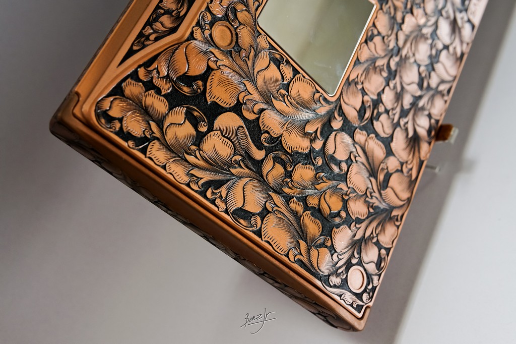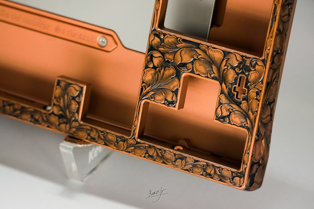 This keyboard piece showcases intricate hand-engraving across its entire surface, transforming a functional object into a refined work of art. The copper-toned base is covered with dense, flowing patterns that create depth, texture, and a strong visual rhythm. Each detail is carefully carved, giving the design a sense of movement and organic growth.